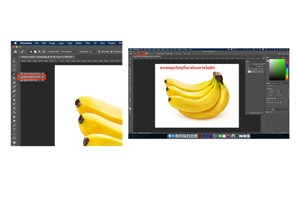 2.ไปที่เครื่องมือ Quick Selection tool จากนั้นทำการลากไปตามตำแหน่งที่เราจะทำการไดคัท