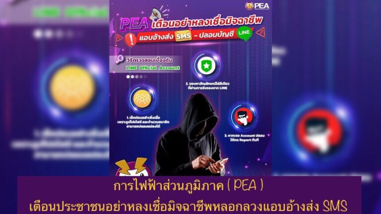 การไฟฟ้าส่วนภูมิภาค ( PEA ) เตือนประชาชนอย่าหลงเชื่อมิจฉาชีพหลอกลวงแอบอ้างส่ง SMS